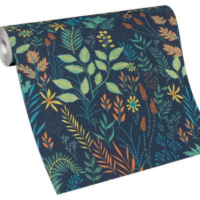 Transforma les teves parets en un jardí de joia i vitalitat amb el nostre exquisit paper pintat amb flors i plantes de colors fons blau marí.