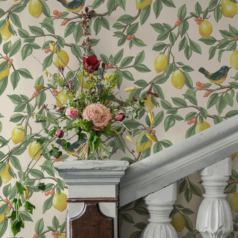 Aquest elegant paper pintat desplega precioses branques de llimoner, on es posen delicats i acolorits ocells entre el seu frondós fullatge, creant una escena plena d’encant i serenitat. La composició captura tant la frescor com la diversitat de la natura, convertint aquest paper pintat en una elecció perfecta per afegir un toc de frescor i vitalitat a qualsevol racó de la llar.