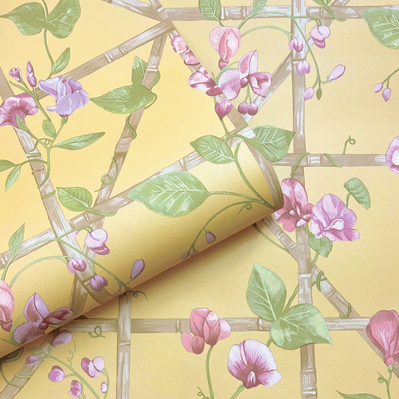 Este papel pintado floral con estructura de enrejado es una propuesta decorativa elegante y atemporal que aporta frescura, ritmo y un delicado aire natural a cualquier espacio. El diseño combina una base geométrica tipo celosía, inspirada en estructuras de jardín, con flores trepadoras y hojas cuidadosamente ilustradas, creando una composición equilibrada, decorativa y muy armoniosa.