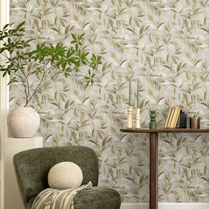 Papel pintado HOJAS DE OLIVO VERDE OLIVA Y MARRÓN 2002
