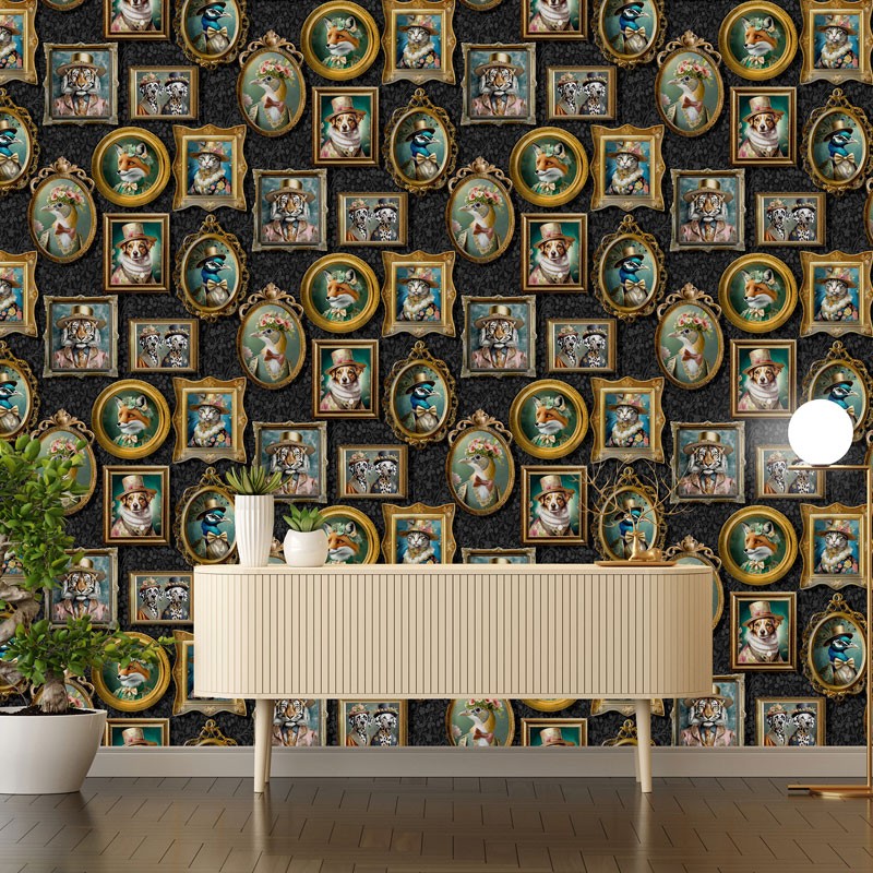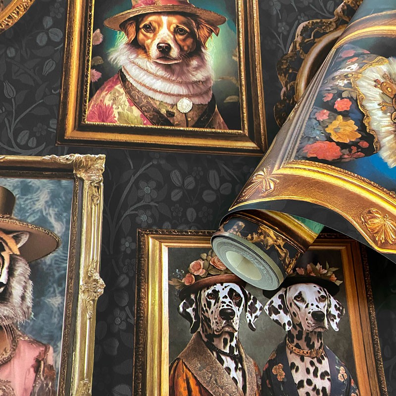 Este modelo específico de papel de parede transforma suas paredes em uma verdadeira galeria de arte com um toque irreverente. Cada ilustração mostra animais vestidos como membros da realeza, com trajes de época e detalhes minuciosos que trazem estilo e personalidade. As molduras douradas, com estética clássica e ornamental, reforçam esse ar aristocrático enquanto o fundo escuro cria um contraste elegante e sofisticado.