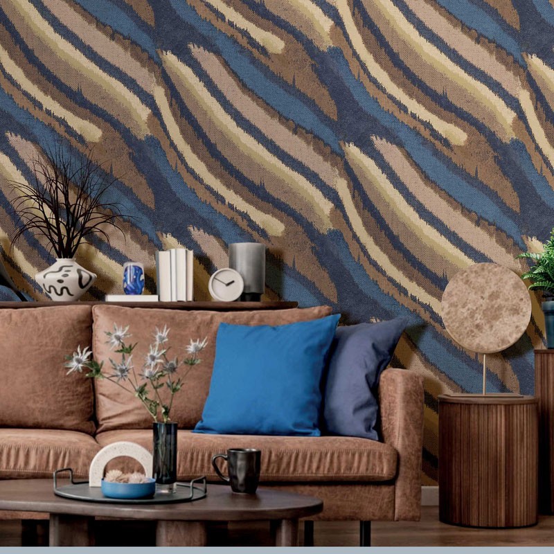 O efeito de tecido da sua superfície realça a textura e confere um acabamento elegante que lembra os tecidos naturais, criando um equilíbrio entre o mineral e o artesanal. Disponível em três combinações de cores,verdes com azul, marrom com malva e azul com areia, este modelo traz calor e sofisticação a qualquer ambiente, seja uma sala contemporânea ou um quarto com um toque natural.