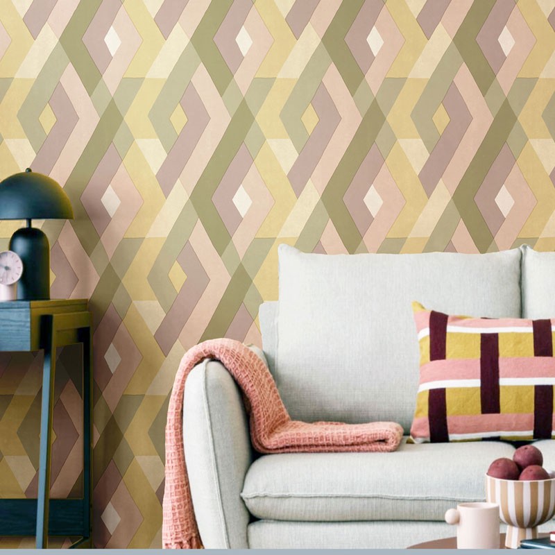 A paleta combina tons naturais e suaves, verdes claros, malvas, ocres e bege, que se adaptam facilmente a ambientes modernos. É um papel pensado para quem procura um toque distinto sem recorrer a desenhos rígidos ou demasiado formais. Se você gosta de papéis de parede deste estilo, recomendamos que você visite a categoria de papel de parede geometrico