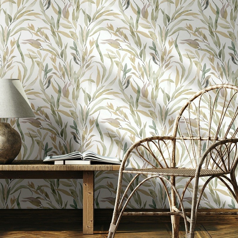 O desenho apresenta folhas estilizadas com acabamento tipo aquarela, onde os matizes verdes se misturam com bege areia e fundos neutros, criando profundidade visual sem sobrecarregar a parede. A combinação cromática transmite calma e sofisticação, ideal para salas luminosas, quartos acolhedores ou espaços onde se procura um estilo natural e contemporâneo.
